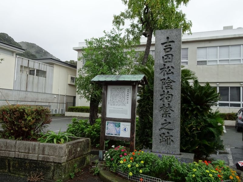 碑の字のごとく吉田松陰が拘禁された場所です。中央公民館目の花壇の中に碑と説明板がありました。