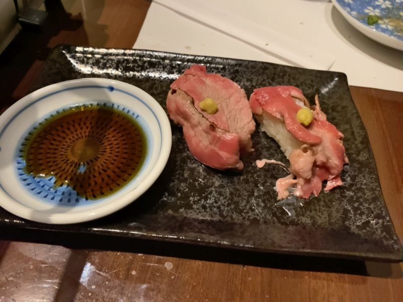 チリトリ鍋というのは野菜・エリンギ・肉の水分少な目の鍋だと思えば良いでしょう。味付けも良かったですよ。肉寿司は、もうちょっと格好良く握った方が良いかな。