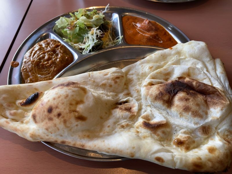 ナン1枚とナンの下にライスが少し添えられていました。これらは食べ放題です。カレーの量が多いので、お替りしたくなります。- 旅行時期