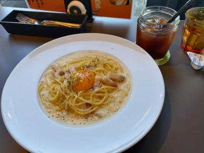 サラダ+メイン+ドリンクで1150円(税抜き)~でランチがいただけます。メインは11種類。カルボナーラ1200円を選びました。外の景色が楽しめる窓際の席でした。