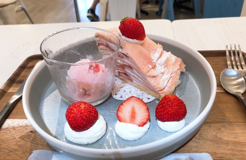 クレープが層になったスイーツプレートは、見た目も豪華で大きいイチゴがたっぷりで大満足のスイーツでした。- 旅行時期