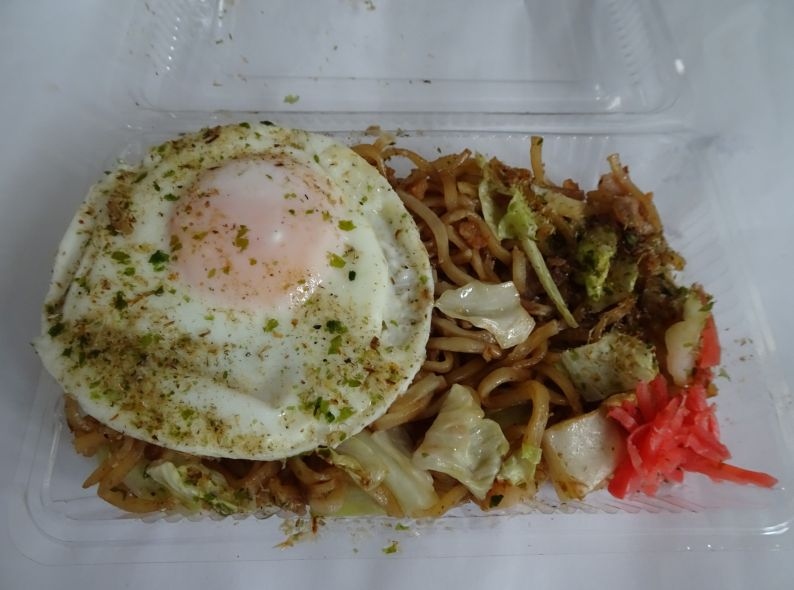 入口も裏口を開け放れて換気はばっちり。しかし、鉄板で焼いている店主の横に常連が座っており、マスクもしないで店主とおしゃべりをしている。焼きそばを入れるトレーの蓋が全部開かないように、その客が指で押さえたりと、感染症対策には疑問が残りました。