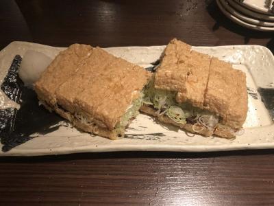 へぎそばの前には当然、日本酒。定番のジャンボ油揚げをいただき、天ぷらもいただく。