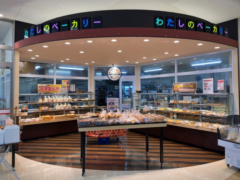 スーパーマーケット田子重 鳥坂店の中にあるベーカリーです。ちゃんとここで焼いています。自分でトレーとトングで取るシステムで、街中のベーカリーと同じです。包装は自分で行って、スーパーのレジで支払います。