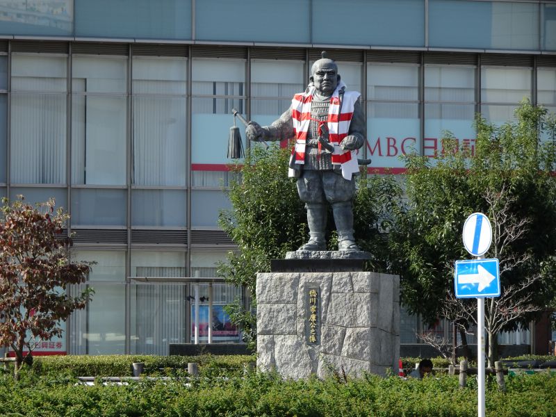 何と静岡駅前の徳川家康公像が赤白ストライプの陣羽織を着ていました。