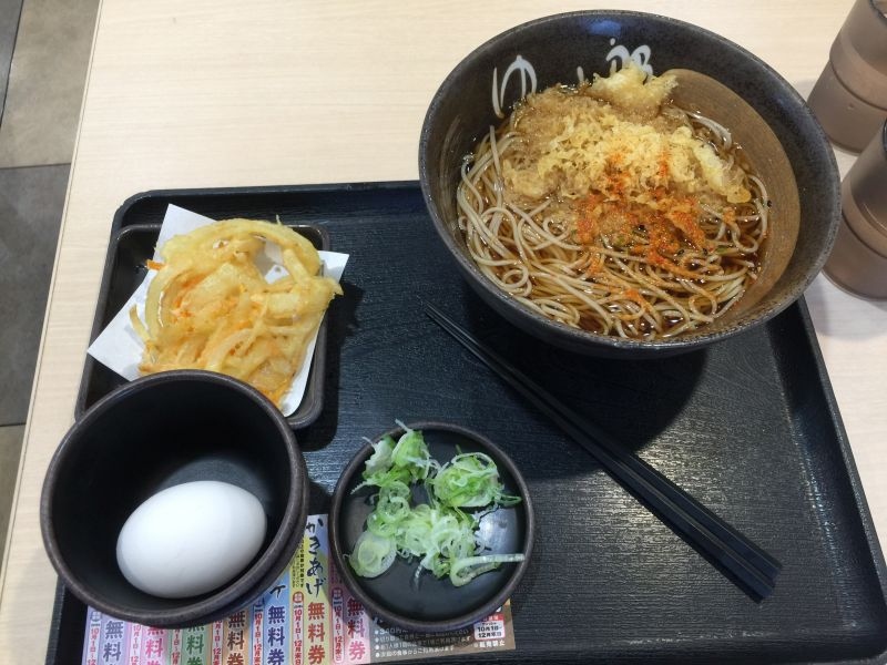 卵・かき揚げが載った蕎麦が税込360円というりーズナブルな設定でした。