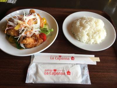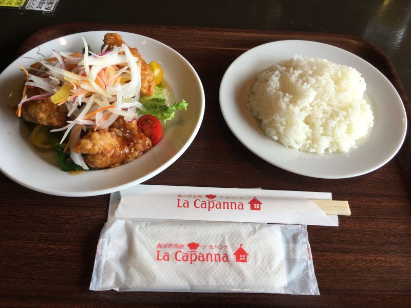 信玄鶏のタッタ揚げを注文。ソースがかかっていますが、衣にはサクサク感が残っています。野菜がたくさん載っているのも良し。