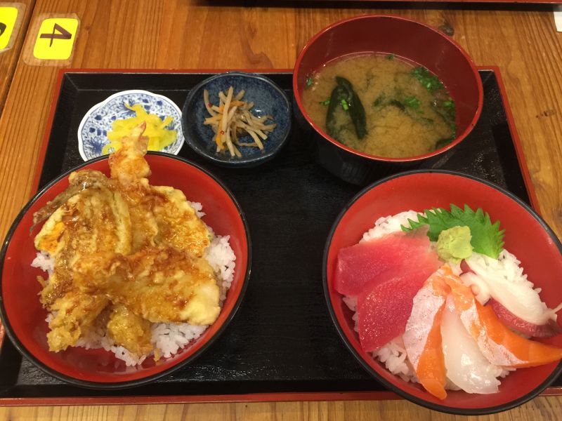 定食のセット(ミニまぐろ丼+ミニ天丼)を注文しました。赤身のまぐろはちょっと薄かったかな。天丼は、イカ、キス、エビ、カボチャが、サクサクで美味しかったです。