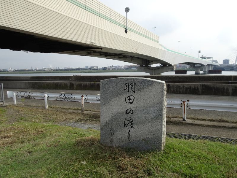 多摩川までテクテク歩いて行くと、多摩川堤防と横羽線高架と交差したあたりに「羽田の渡し」という碑が建っていました。