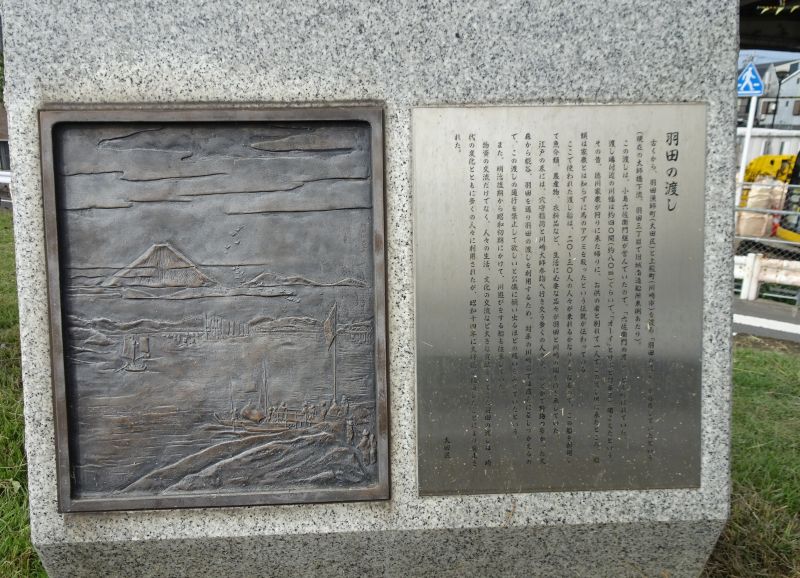昔、羽田と川崎市を渡していたそうです。碑の後ろには、渡し船の様子が架かれた銅板(鉄板?)が施されていました。