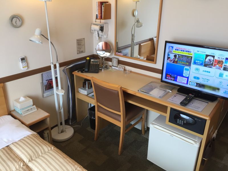 部屋は東横インの通常サイズだから狭いが、品川駅前に7000円台で泊まれるのだから仕方ない。スーツケース持ち込みの人は、広げるスペースもないで、シングルは避けたほうがよいでしょう。