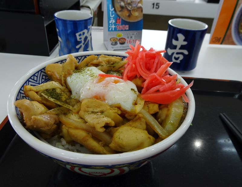新商品の鶏すき丼を注文しました。甘いタレに鶏皮少な目の軟らかい正肉で自分の好みにぴったり。半熟卵が標準で付いてくるところがポイント高し。卵とタレが混ぜると、すき焼きの味と同じですね。- 旅行時期