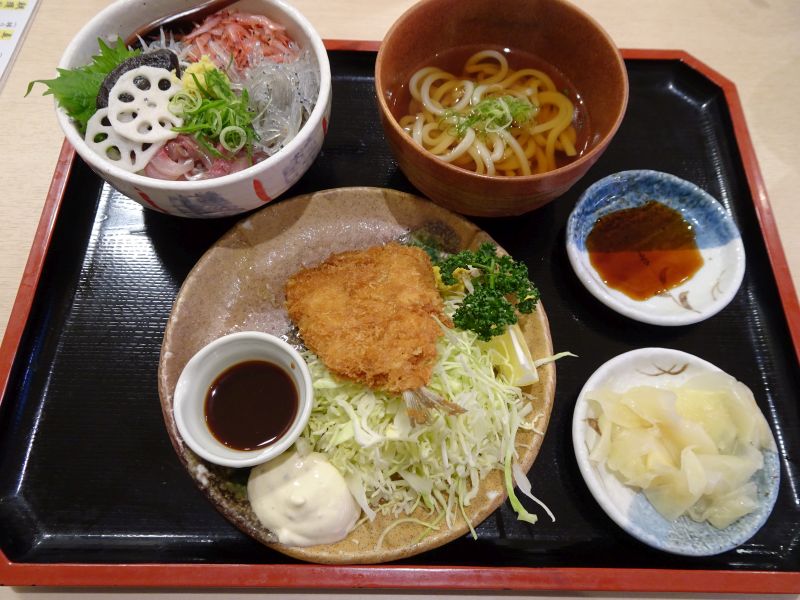 寿司だけでなく天丼もありました。メンズランチという海鮮丼、アジフライ、うどんが付いた1100円(税別)の定食を頼みましたが、海鮮丼だけでなくアジフライも厚くてジューシーで満足いくものでした。