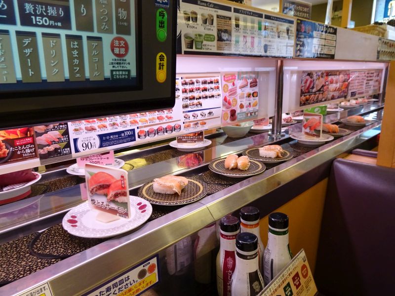 ほとんどがタッチパネルでの注文。注文された寿司は台座に乗って、一段高い状態でレーンで運ばれてくる。