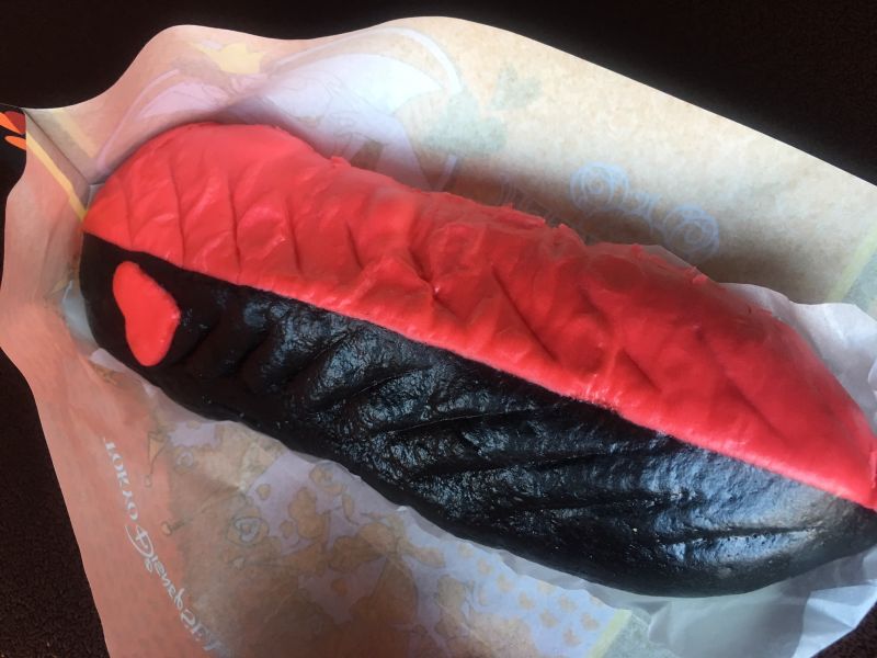 赤黒のツートーンギョウザドッグ、毒々しい色ですが、見かけによらず味はなかなかいける。