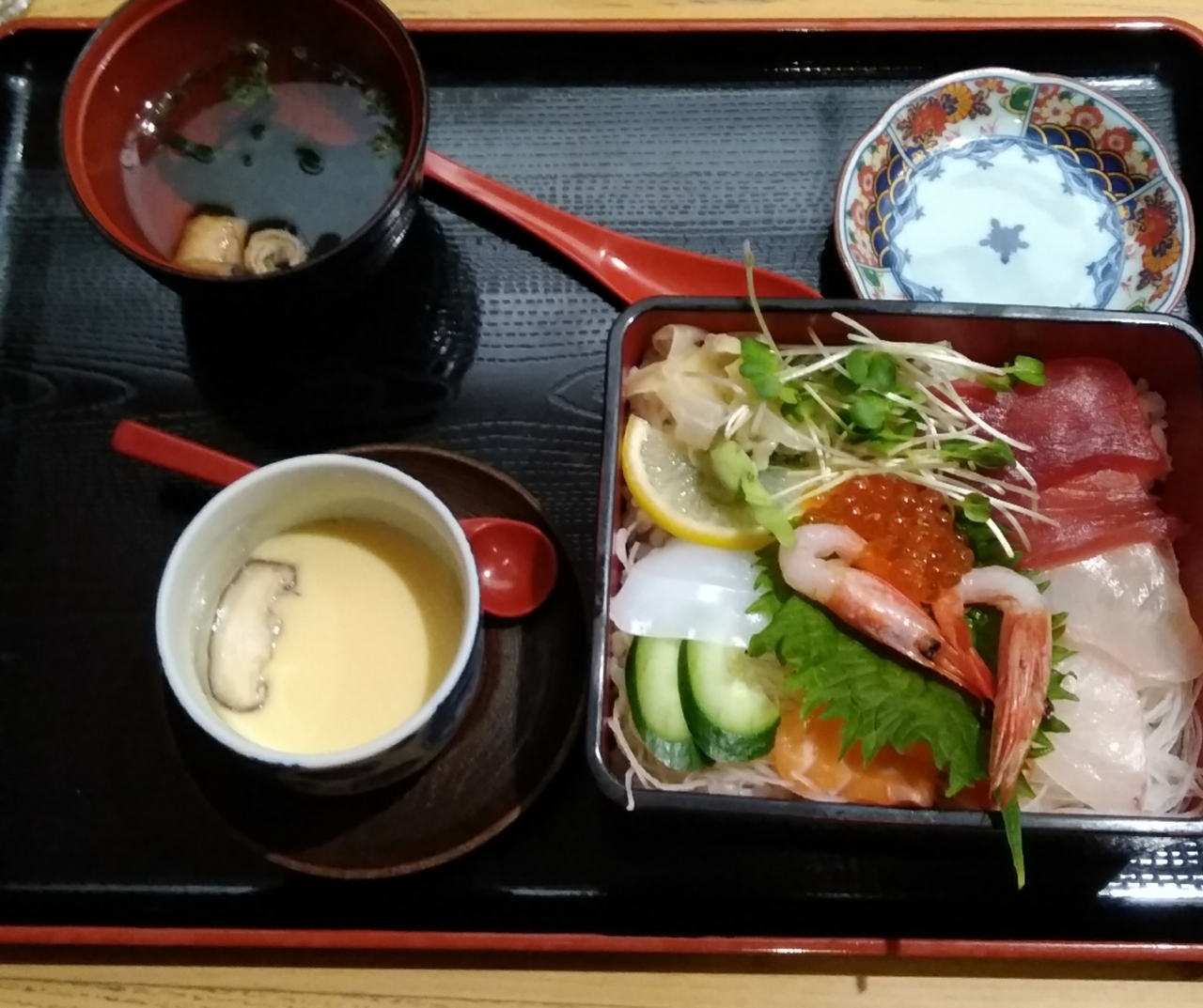 ランチタイムには千円以下で海鮮丼や日替わりが食べられ、食事にはセルフのドリンクバー付きで、価格、味共に良いお店でした。