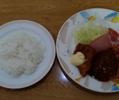 コーンスープにハンバーグ、白身魚のフライ、スパゲッティといった
