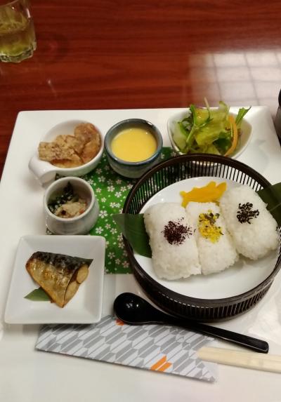 ランチタイムに行き、数量限定の「長崎ぶらりのお昼ごはん」というのにしてみましたが、小さなおにぎり3つに少しずつの焼き魚や鶏の唐揚げがあり、味は美味しかったのですが、ボリュームが少々足りない感じでした。