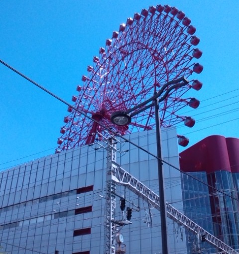 梅田のど真ん中にある商業施設で、ビルの上の観覧車が特徴的です。