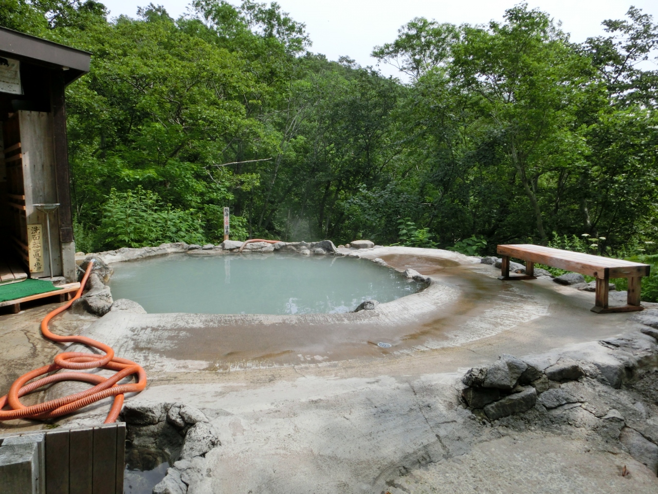 上流からの温泉と川の水が混じって30度ちょっと、温水プールのような感じだ。ただしphが1とか2の強酸なので皮膚の弱い方は要注意。