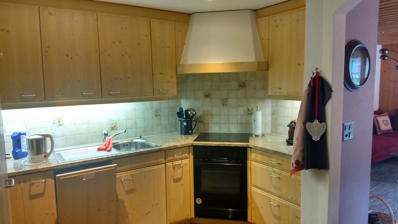 キッチンには一通りの物がそろっている。鍋、フライパン、トースター、オーブン、ケトル、電子レンジ、フォンデュ鍋、冷蔵庫、コーヒーメイカー、紙フィルター、ペーパータオル、食器、カトラリー、食洗機、塩コショウ。ホイル、ラップなし。食洗機用の洗剤しかないのでちょこっと洗いたい時に不便。