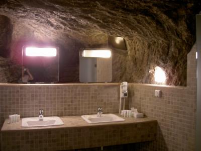 ベッドルームにはバスルームへ続くドアがあるのだが、岩をくり貫いたトンネルを通って行く。部屋ほどもありそうな広いバスルームの壁はむき出しの岩。シャワーブース、ジャグジーバス、簡易乾燥機がある。