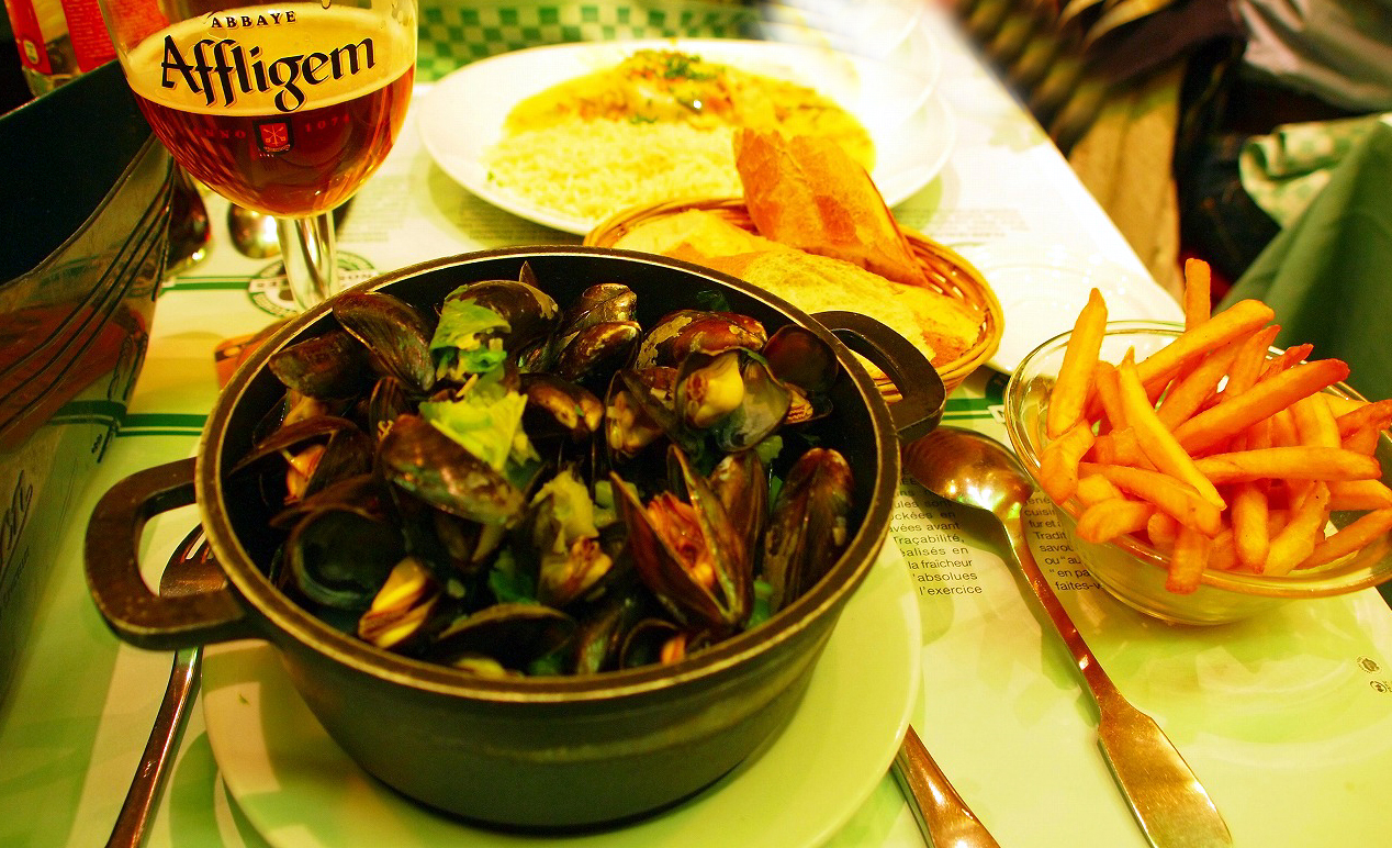 セーヌ川クルーズのあと、疲れず適当に食べることができるレストランを教えてと、添乗員さんに聞いたところ進めてくれたのがレオンでした。バケツというか炊飯器の釜部分みたいな容器に、沢山のムール貝のワイン蒸しが出てきました。とても美味しく、ワイン蒸しのスープをフランスパンにつけて食べました。