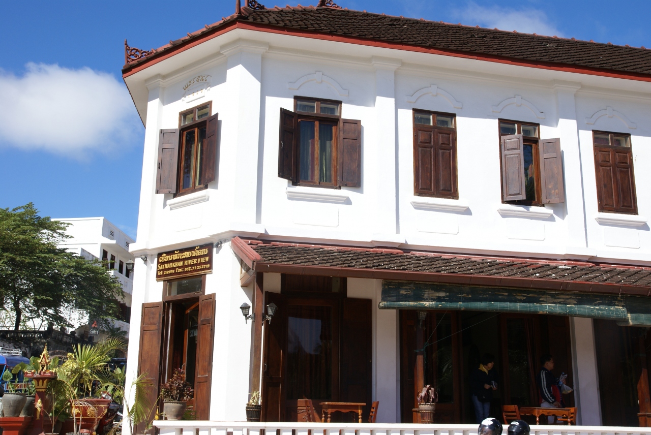 ナムカーン川のほとり、向こう岸への竹の橋の前に建つ、白亜のクラシックな二階建ての建物。