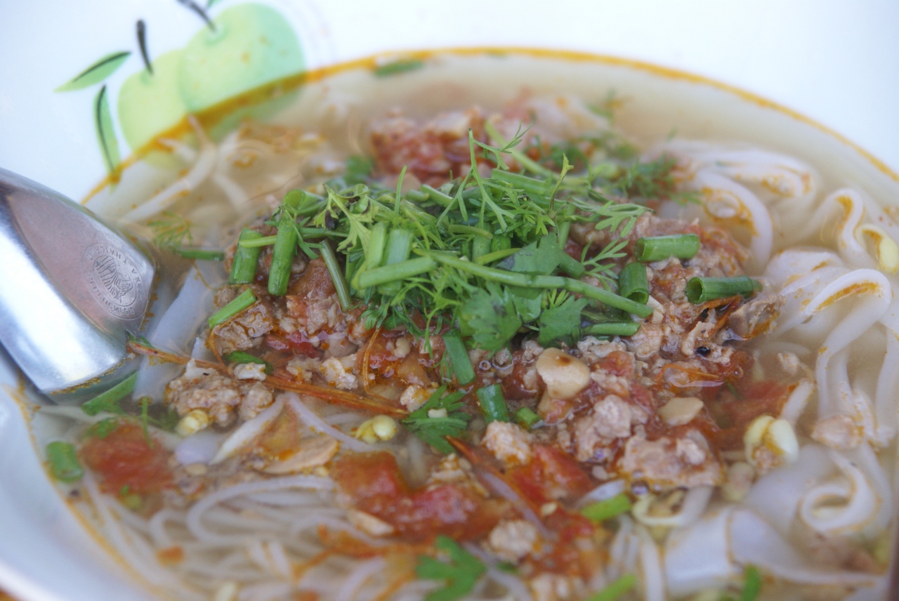 カオソーイは米の麺に、辛味入り挽肉炒めをのせたローカル料理です。