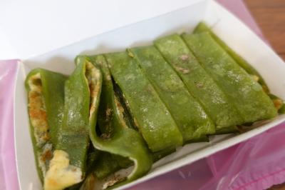 抹茶焼餅、見事に緑色ですなぁ。ソース掛けてけと言われたけれど、抹茶風味...