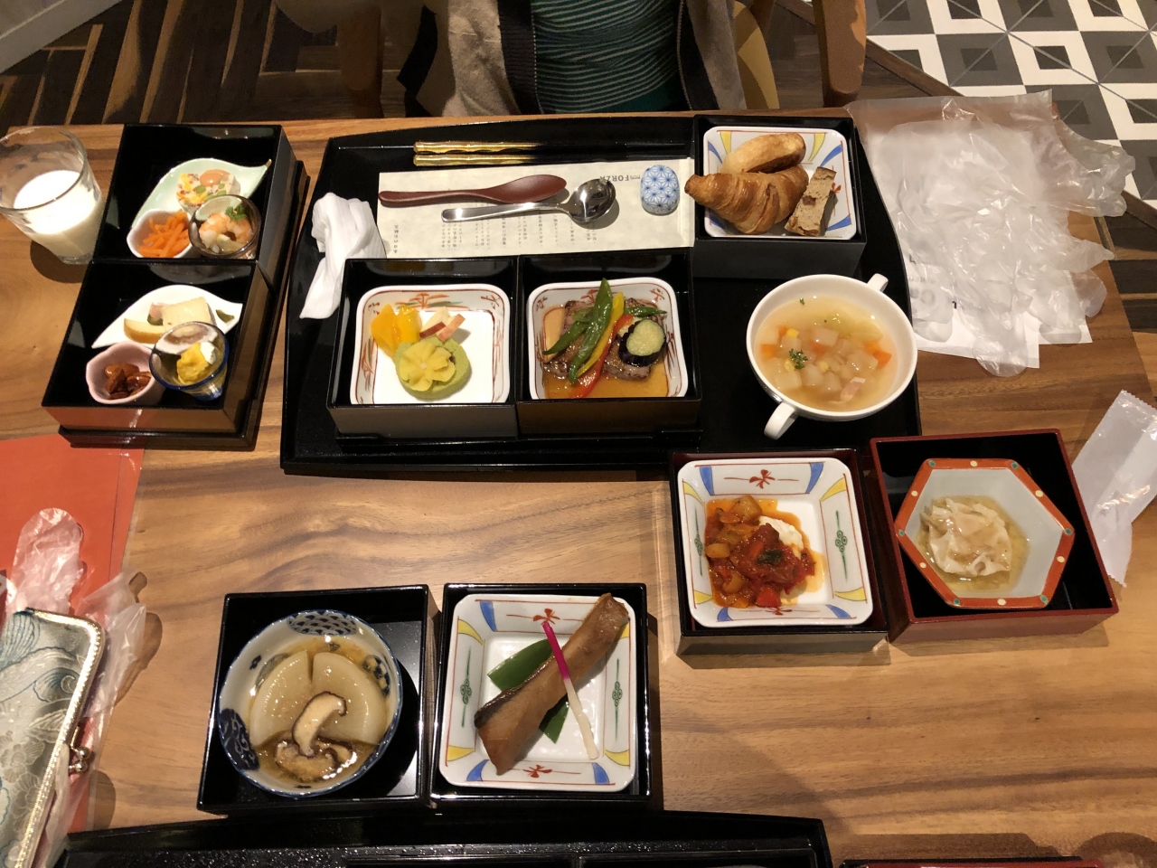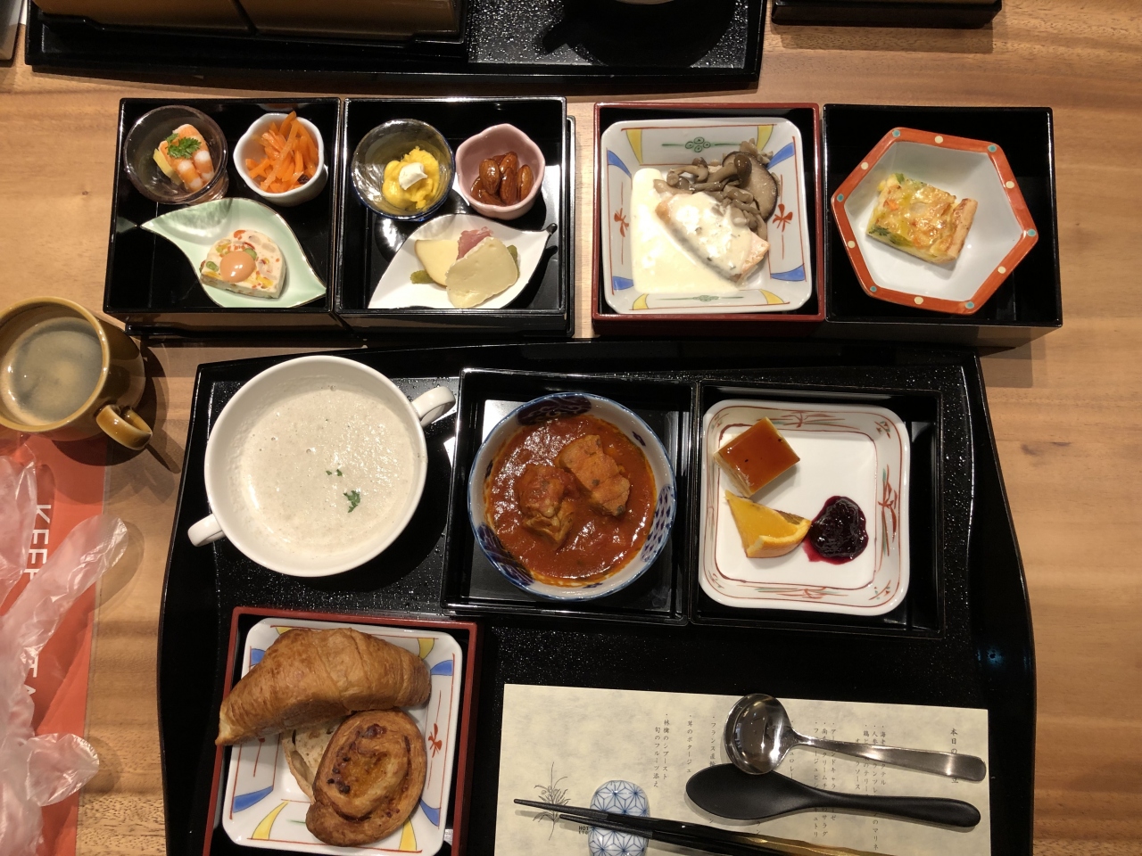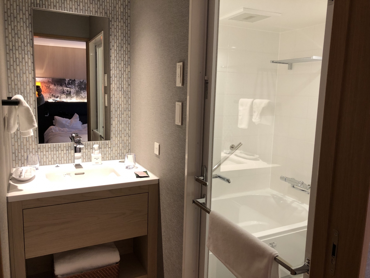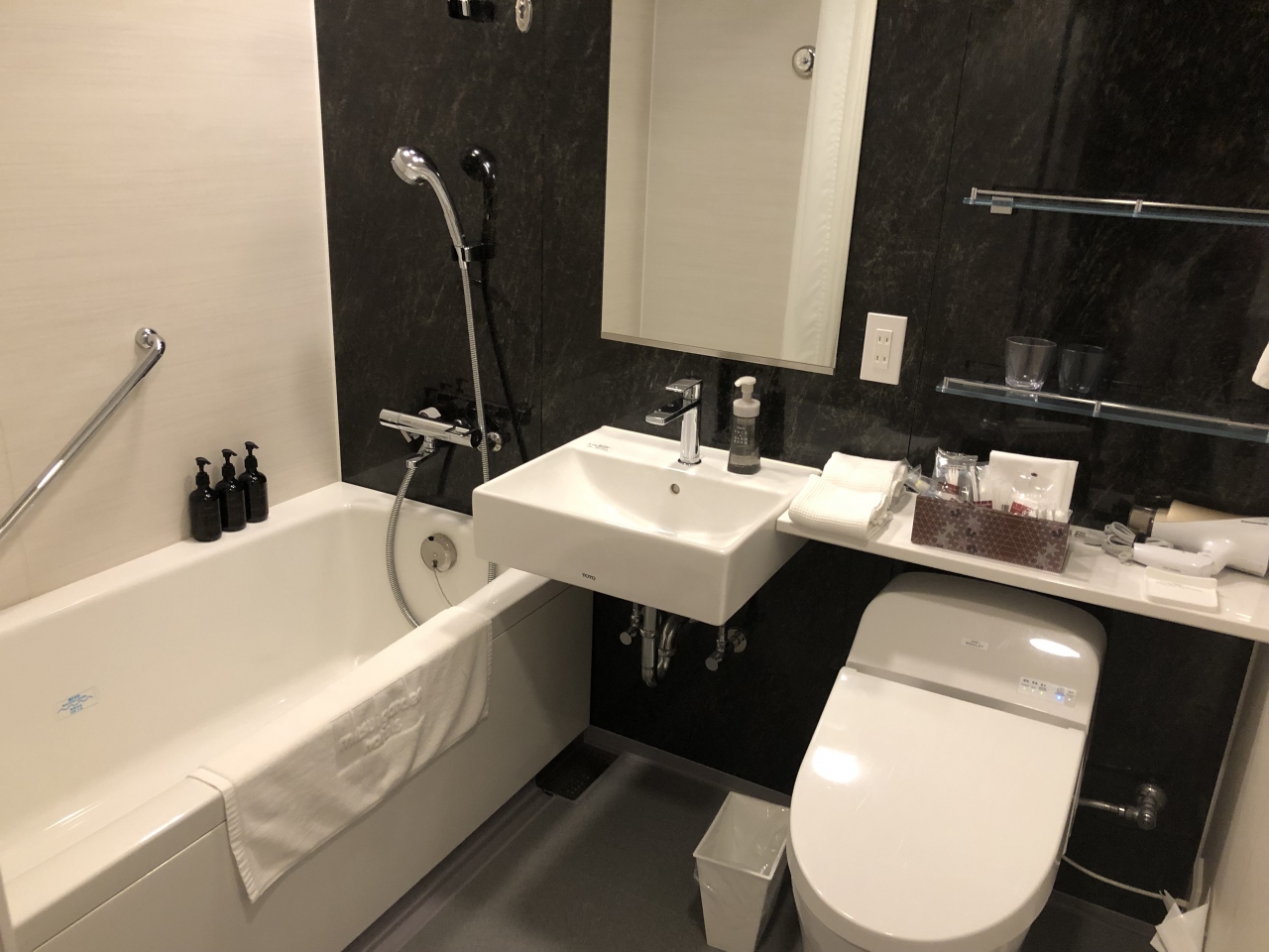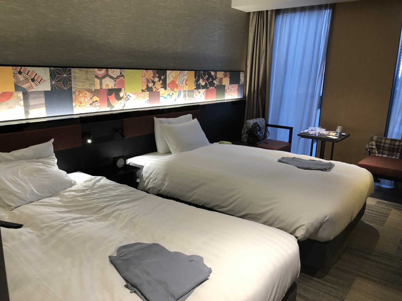 京都駅から地下鉄烏丸線で3駅6分、烏丸御池駅の出口を出てから徒歩1分ととても便利な立地です。駅ホテル間は乗り換えも無くスム-ズに移動できるので時間を有効に使えます。ツインでも部屋は少し狭いですが、スーツケ-スを広げて荷物の出し入れは問題ありません。部屋にイスが1つしか無いのが不便でした。ユニットバスですが、ホテル内に温泉大浴場があり部屋の風呂を使用しなくても大丈夫です。食事はバイキングで種類も豊富、4泊しましたが飽きずに美味しくいただきました。宿泊費は旅行支援などもありかなりお安く泊まれました。
