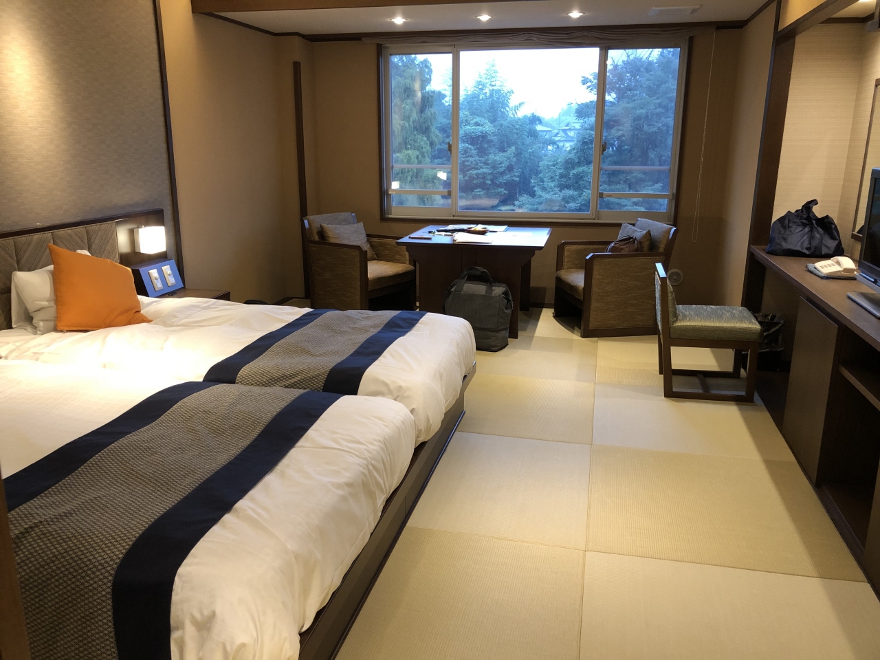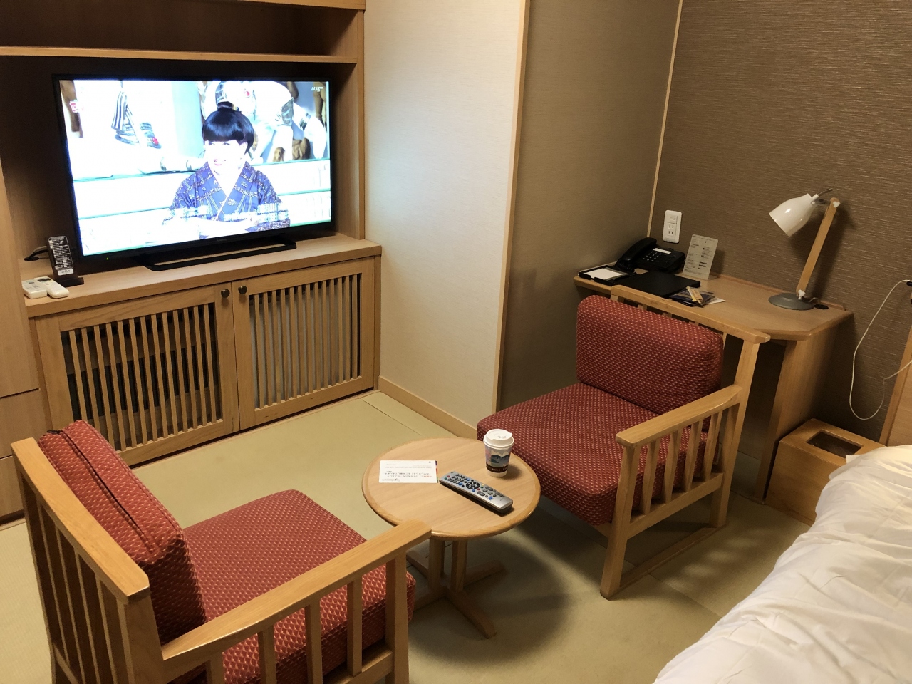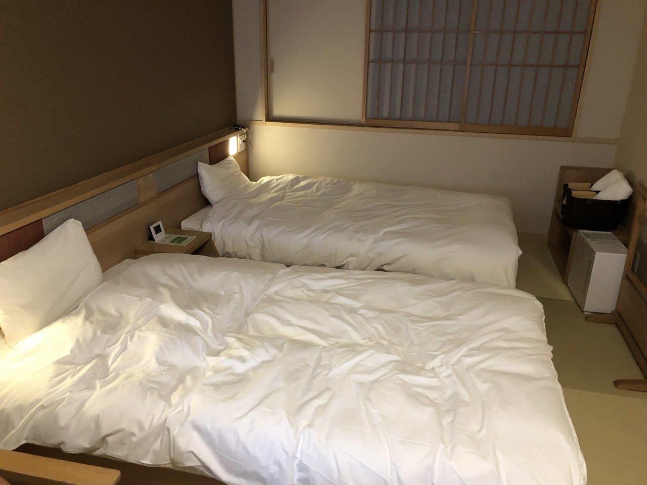 温泉大浴場付きのホテルでゆっくりとくつろげる宿です。館内は清潔感があり、畳敷きで素足でも暖かく歩けます。部屋は洋風ツインですが畳敷きなのでゆったりできます。朝食はバイキングで種類が豊富でとてもお得です。大浴場は広くて露天風呂もありとても良かったです。