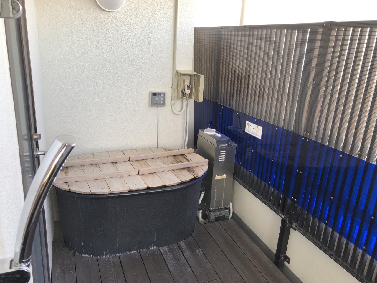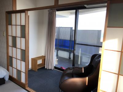 部屋は畳敷きにベット、マッサ-ジチェアとベランダには露天風呂が付いていました。露天風呂は朝温泉を汲んで保温しておくタイプの様です。足し湯は水道水なのでぬるくなると