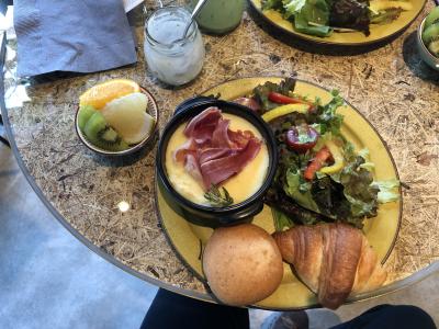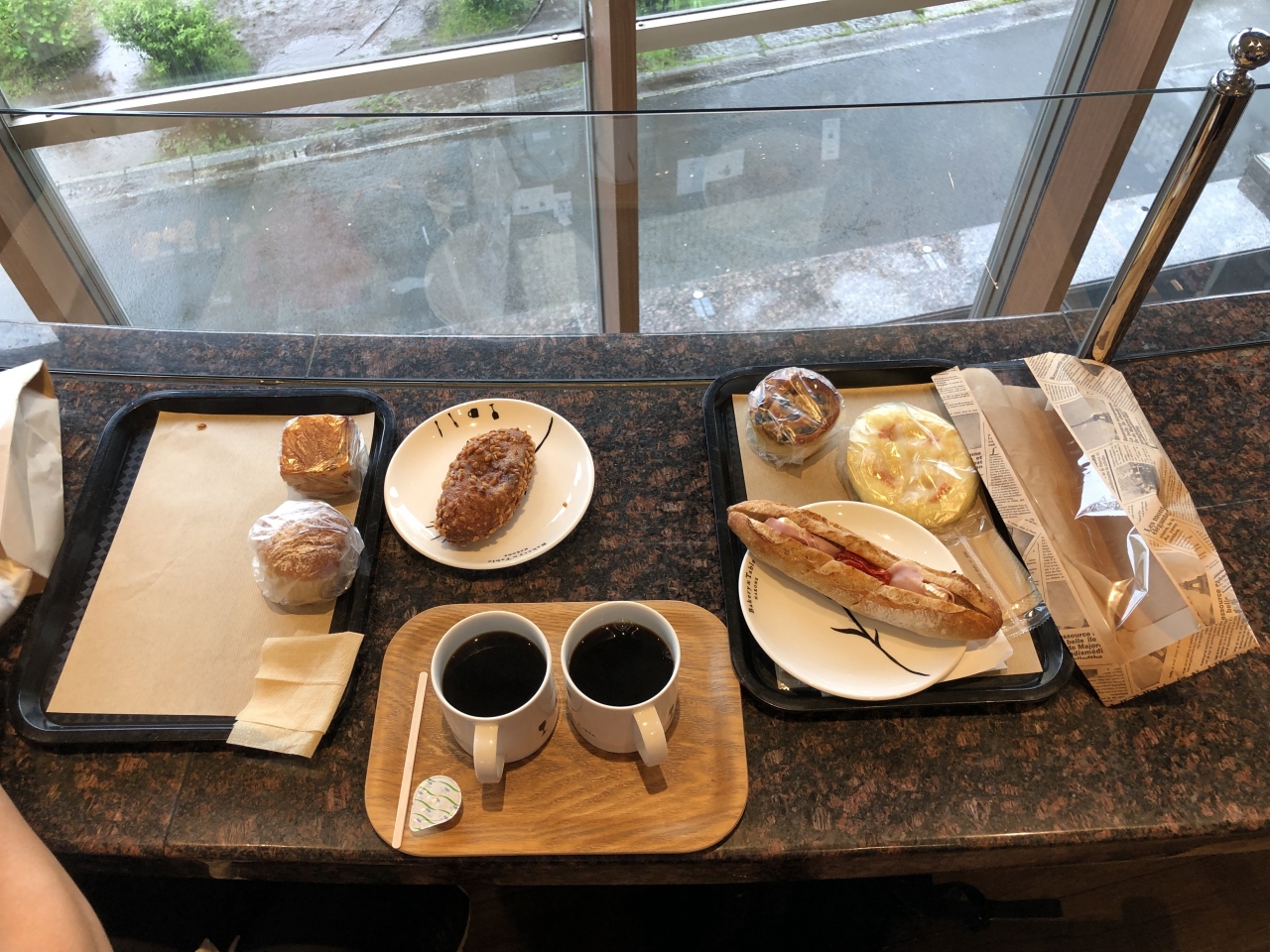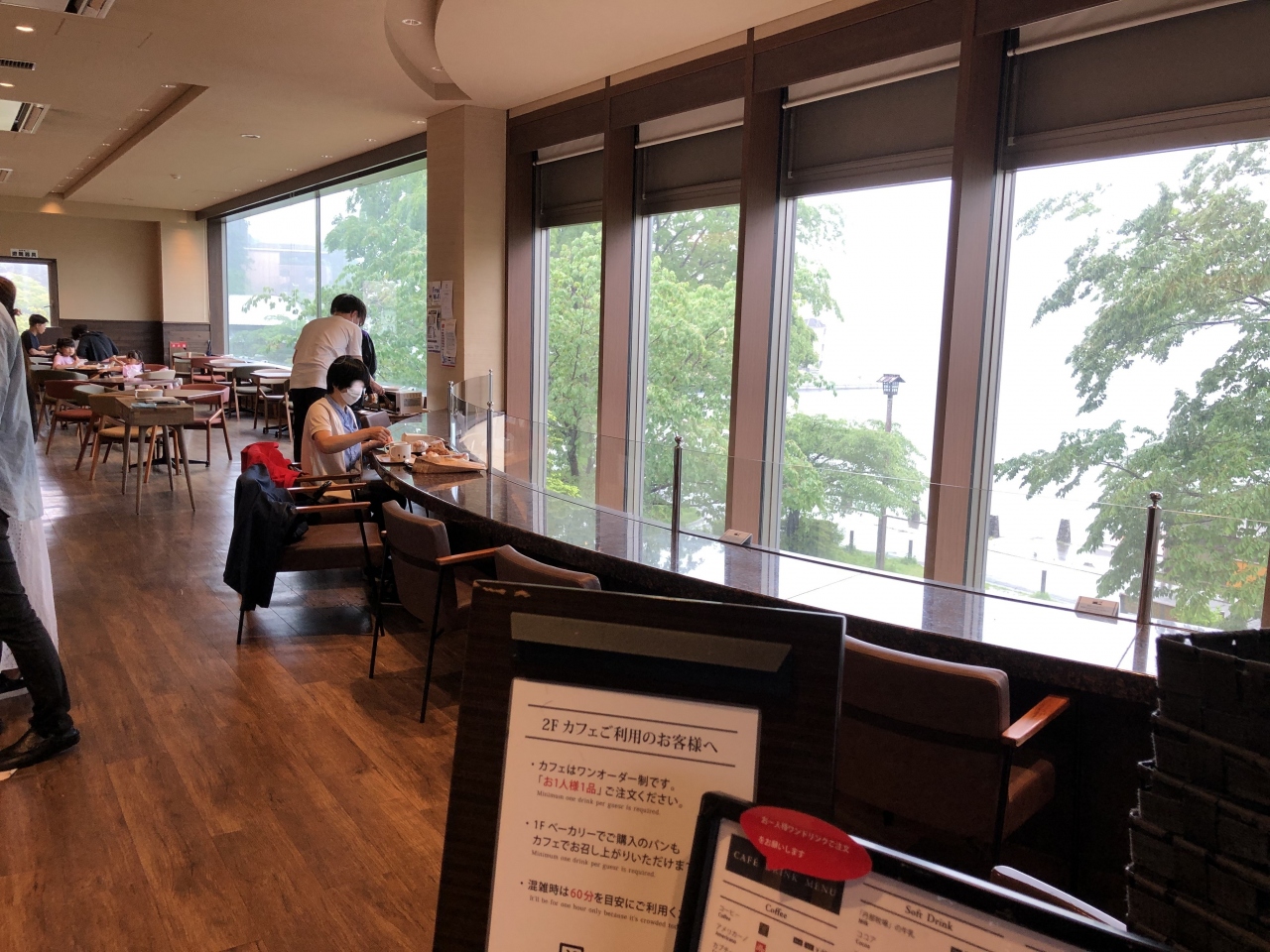 店の前には湖を見ながらイートインできるテーブル席と足湯があります。残念ながらの雨で屋根もないので利用できませんでした。1Fで好みのパンを選びレジで購入。6種類のパンを選び二人でシェアしました。どれも美味しかったです。人気No.1は米粉のカレードーナツということで紙袋に入ってます。お洒落な店内でパンの種類も豊富です。購入したパンは2Fでドリンクを注文し、イートインできます。2Fはテ-ブル席とカウンタ-があります。せっかくなので目の前に芦ノ湖が広がるカウンタ-席に陣取りました。3Fはセットメニュ-のレストランになっている様です。