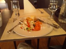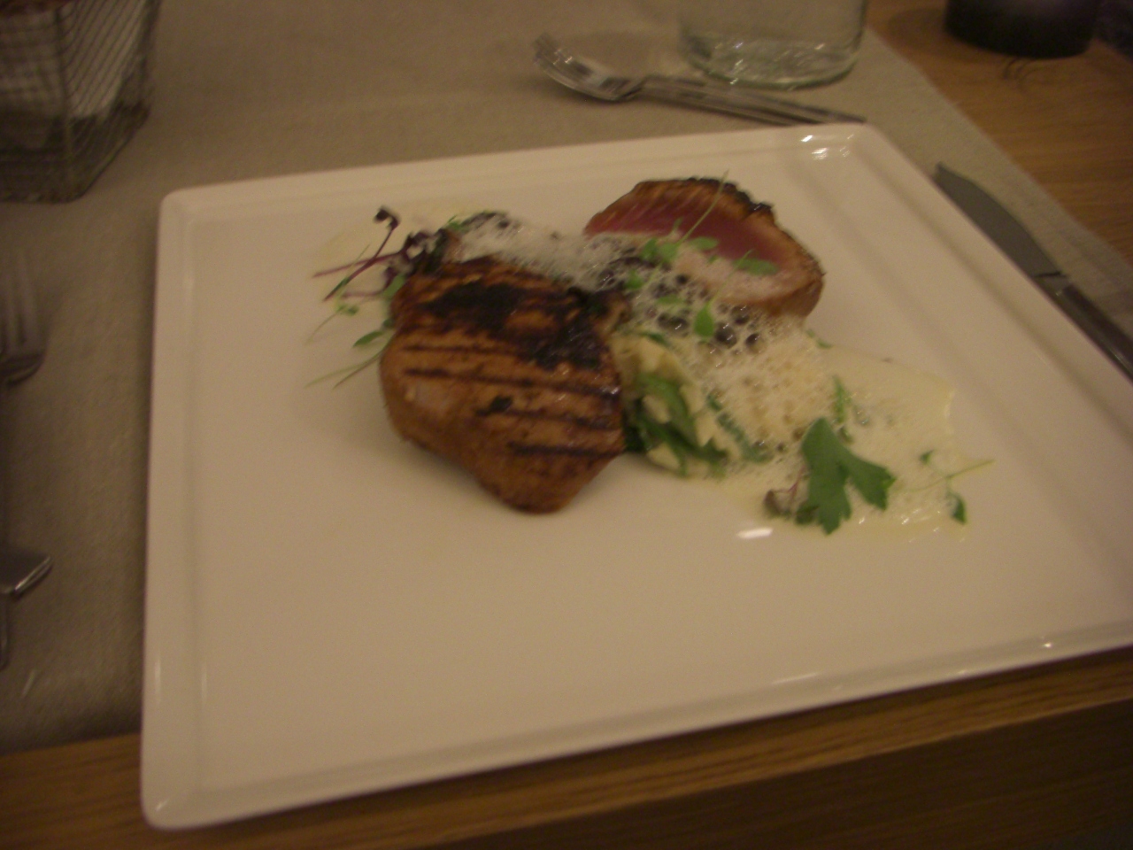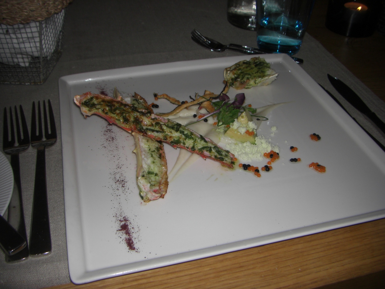 北欧の料理に飽きてきたのでシーフードレストランに行ってみました。隣の人の食べてるのがおいしそうだったのでカニのバター焼きとまぐろのリゾットとデザート、コーヒーのセットにしました。カニが絶品で生きかえりました。全部で45ユーロくらいでした。地下にありお店の雰囲気もかなり良いです