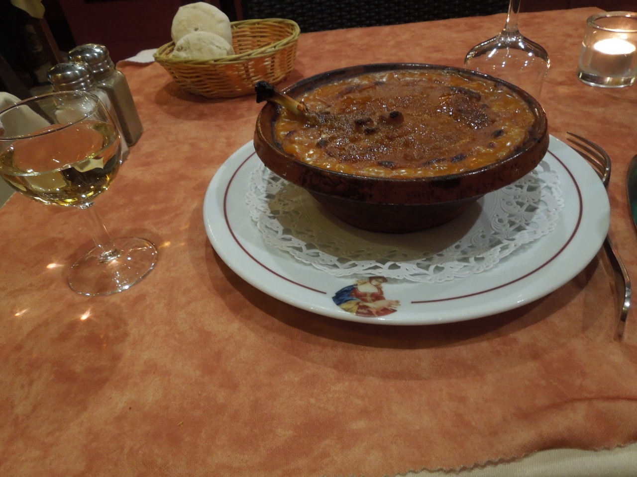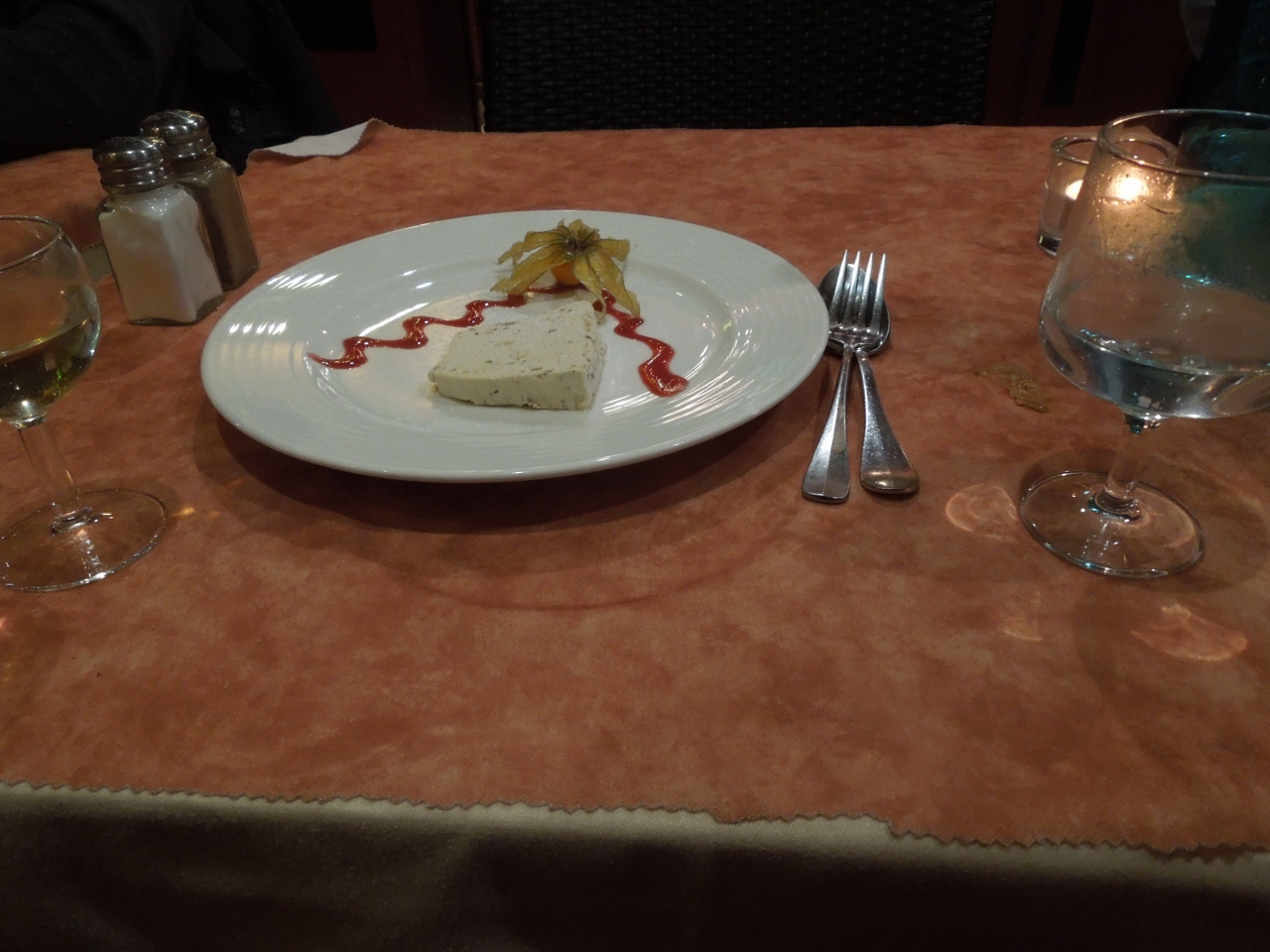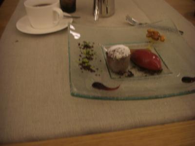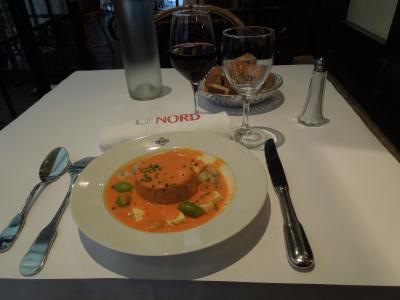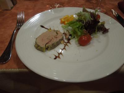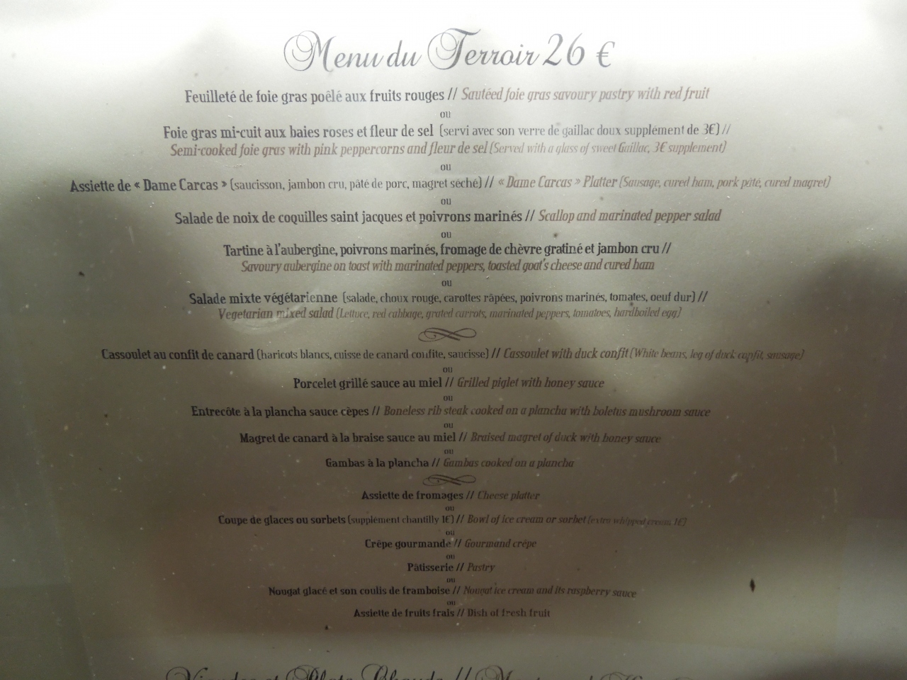 シテの中の数少ないお手軽なレストランです。15ユーロと26ユーロのセットメニューがあり26ユーロのメニューにしました。冷製フォアグラの塩で味付けたものとカルカソンヌ名物カスレとデザートにフランボワーズのソースがかかったアイスです。フォアグラがランドック・ルション地方の銘産でおいしかったです