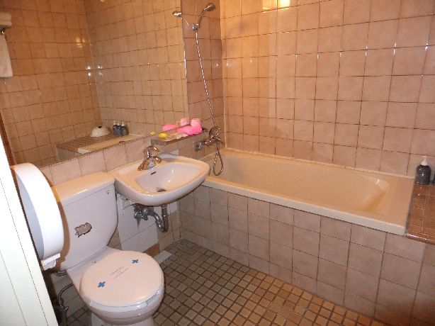 - タイル張りの旧型の浴槽。ホテル内のサウナ利用がBest
