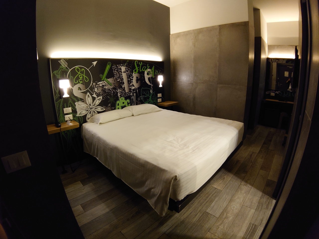 部屋は少し狭いかなと思ったが、スーツケース置き場はある。タオルも毎日交換してくれるし、チェックインのときフロントの方も感じが良かった。廊下のデザインポップだし、ミラノセントラル駅から5分以内でとても便利。ただ入口のドアが分かりにくく、二回通りすぎた。