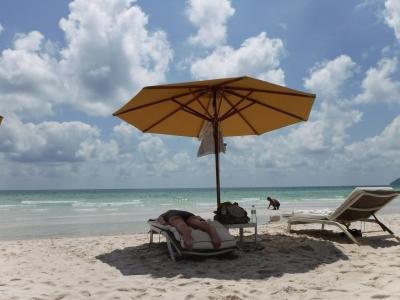 タクシーで到着して、建物に入ったらすぐ300.ドン払うように言われました。もう少し安い方に行こうとしたけど、全部同じ値段だと言われ、2人で150.ドン支払い、パラソルとビーチチェア2台借りました。タオルも1人1枚貸してくれます。