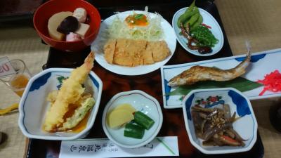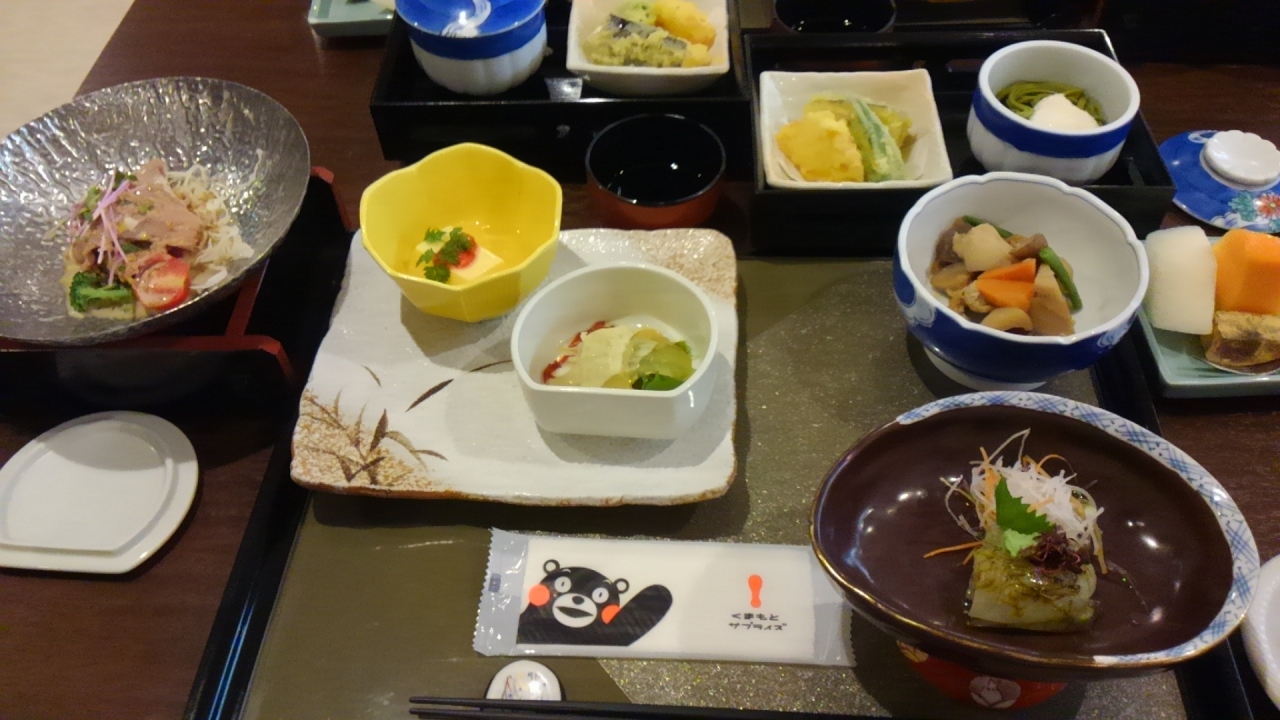 阿蘇市、内牧温泉です。部屋は広くて快適です。料理はまあまあ普通です。売店が18:30からオープンなんで。酒が無い。フロントで聞いたら二つ先の信号の所にある。と聞いて買いに行きました。宴会場の酒は300ccで1000です。買っておいてよかった。