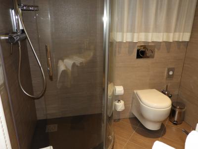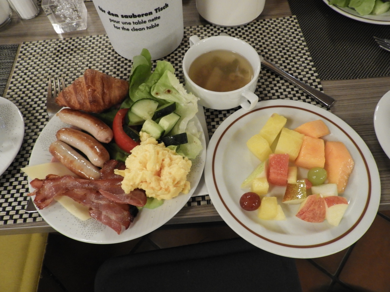 2ベッドルームにリビング付きの広い部屋でした。今回で一番広いです。4人部屋ですね。普通、中にドアがあって2部屋繋がるようになっているんですが。バスルームも浴槽付きで明るくて広いです。ここで2泊、朝食もハム、ソーセージなど種類も多く食べ過ぎました。