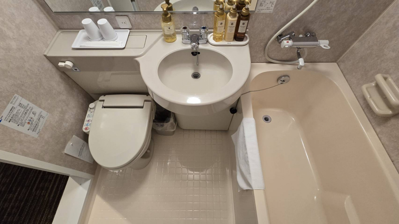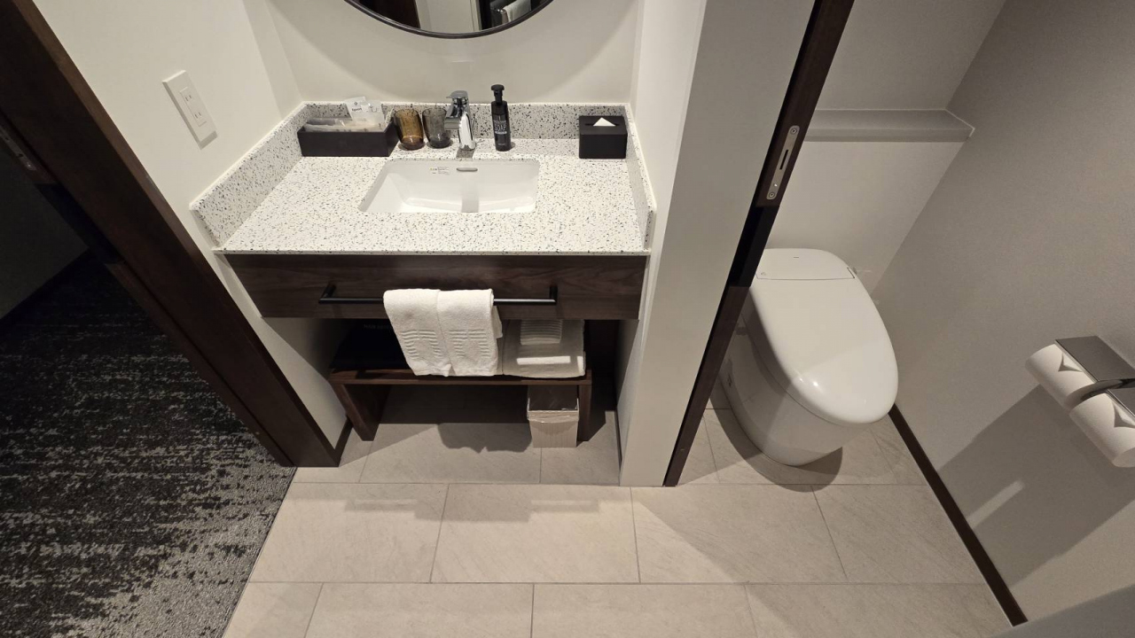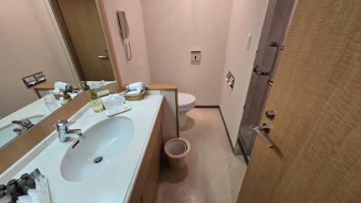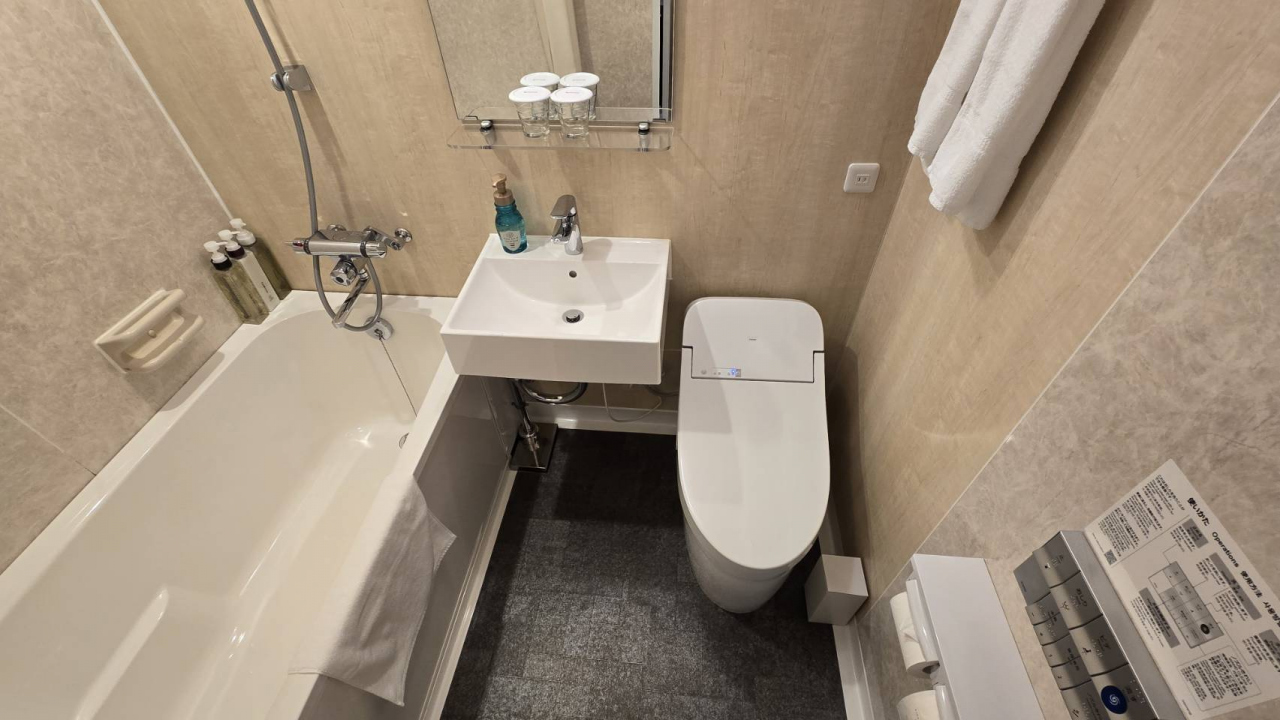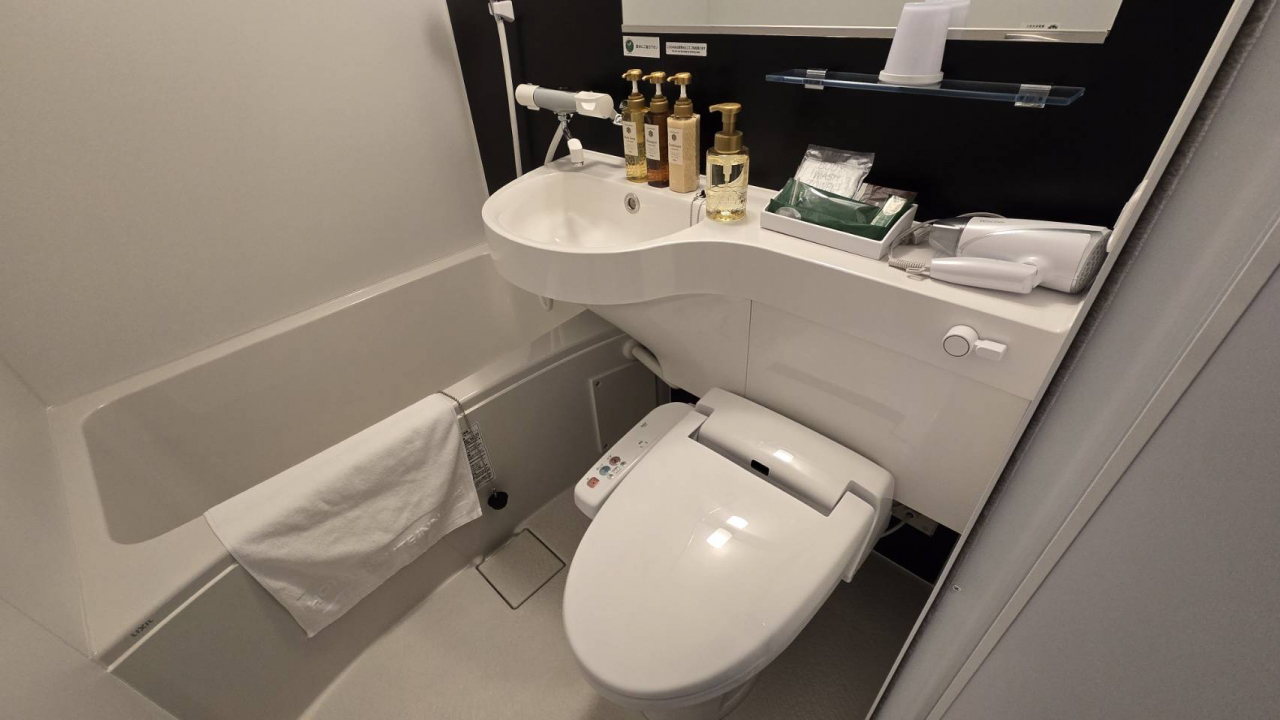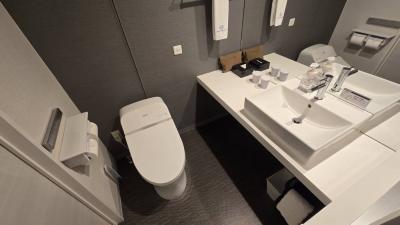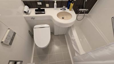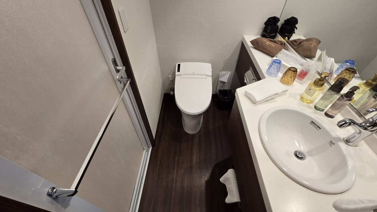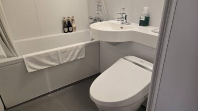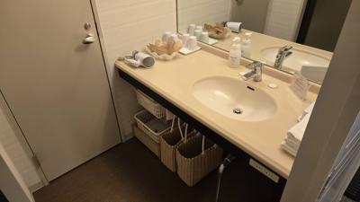 部屋はシモンズのベッドにデュベスタイルのベッドメイキング、貸出品で加湿空気清浄機も用意してくれるので快適に過ごせます、また水回りは洗面台とトイレは同室ですが使いやすくお気に入りです、アメニティは部屋に準備されています