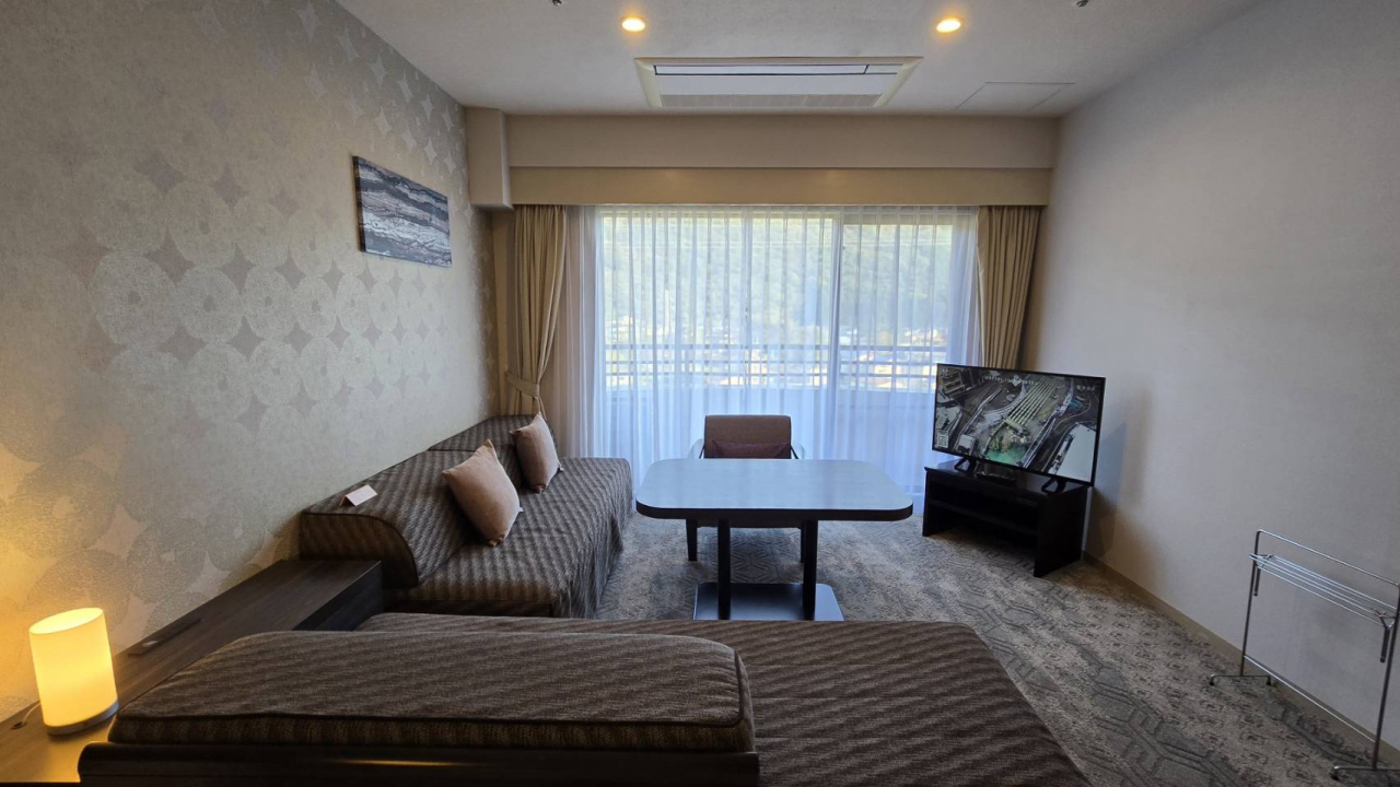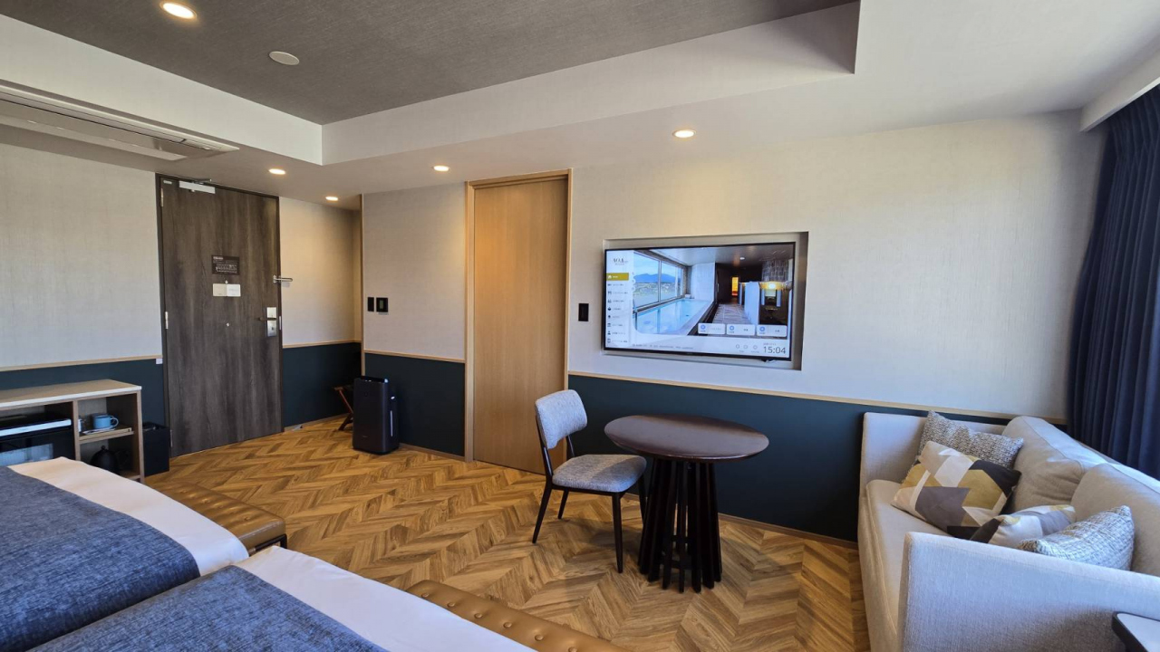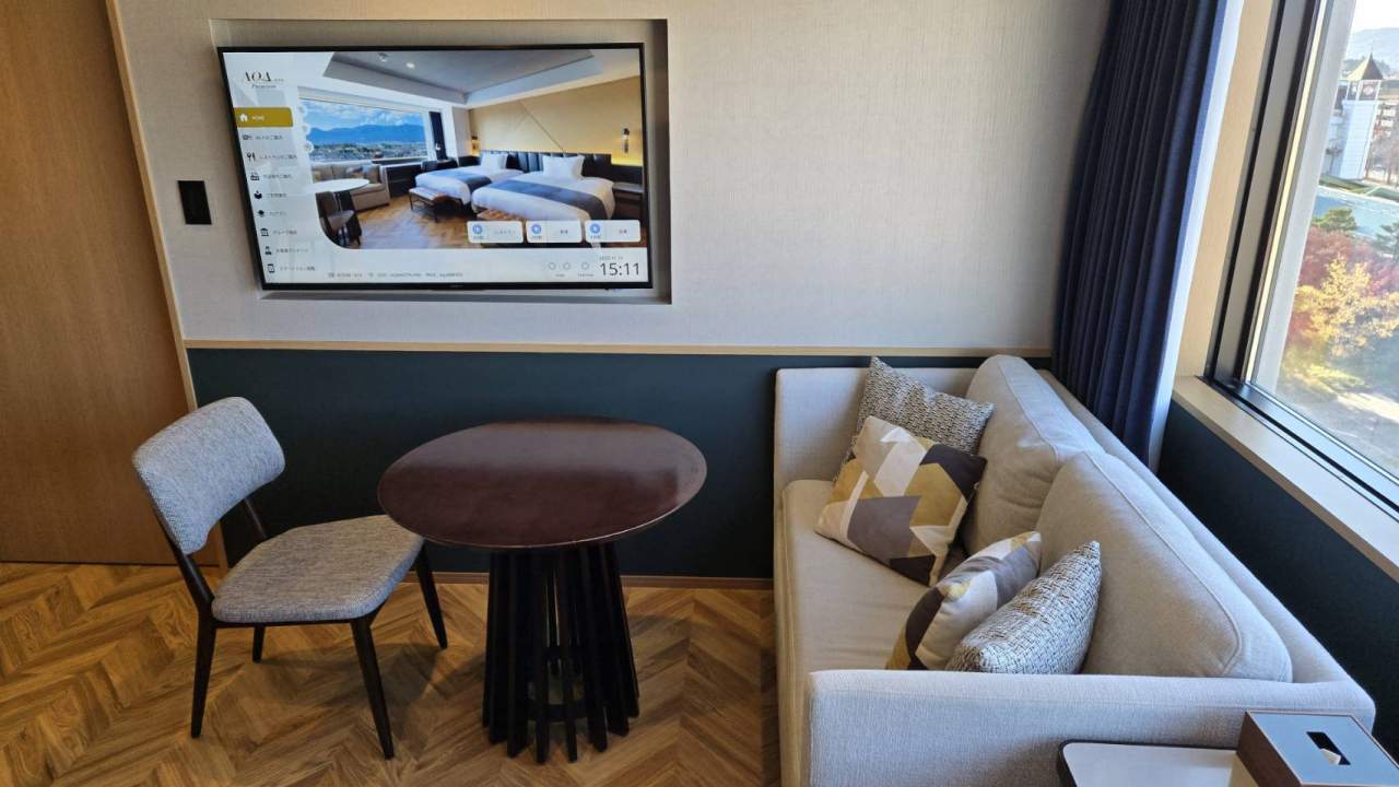 部屋は37㎡で広く、浅間山も望めるワイドな窓に、140cm幅のデュベスタイルのベッドメイキングのベッド2台に、加湿空気清浄機、スマートテレビ、食事がとれるテーブルにソファーにイスで快適に過ごせました