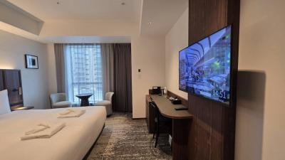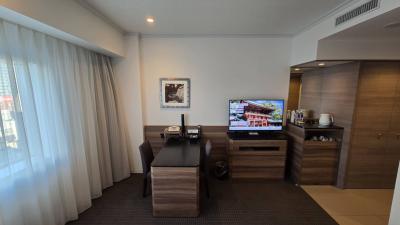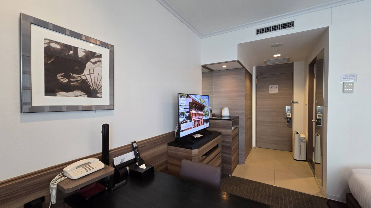 部屋はホテルで一番広い28㎡でデュベスタイルのベッドメイキングのベッドに加湿空気清浄機、スマートテレビ、壁掛けテレビの下のカウンターが広く長いので連泊時は荷物が色々置けて引き出しもあるので便利で快適に過ごせました