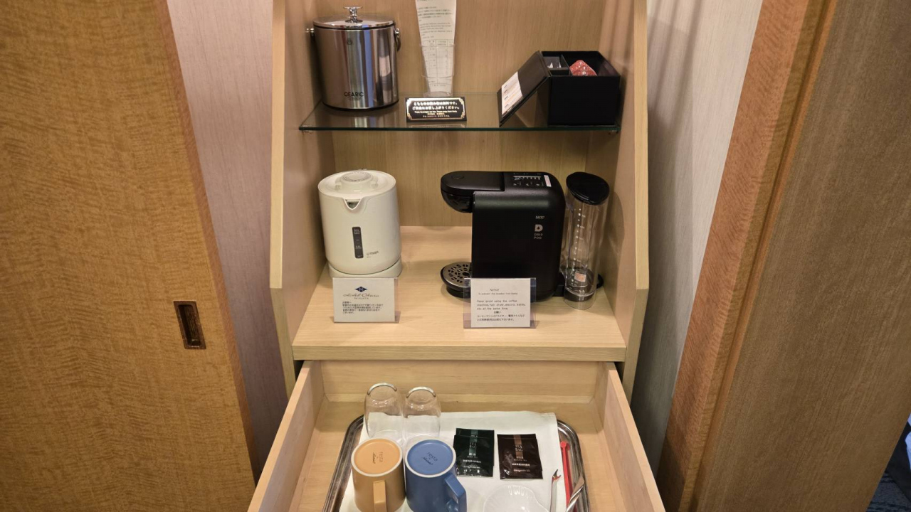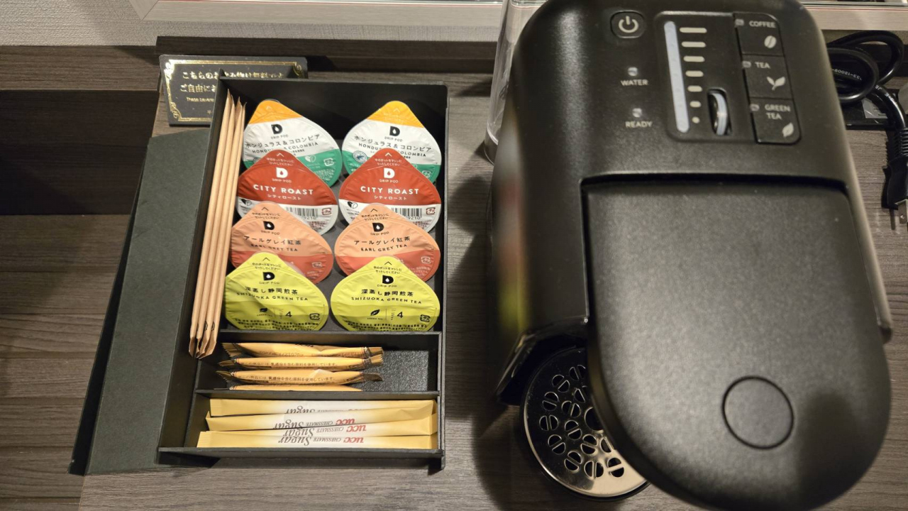 アメニティは1階フロント前のアメニティバーから必要な物をもらいますが、通常の物の他に入浴剤や基礎化粧品、ホテルオリジナルのドリップコーヒーに緑茶と良いですね