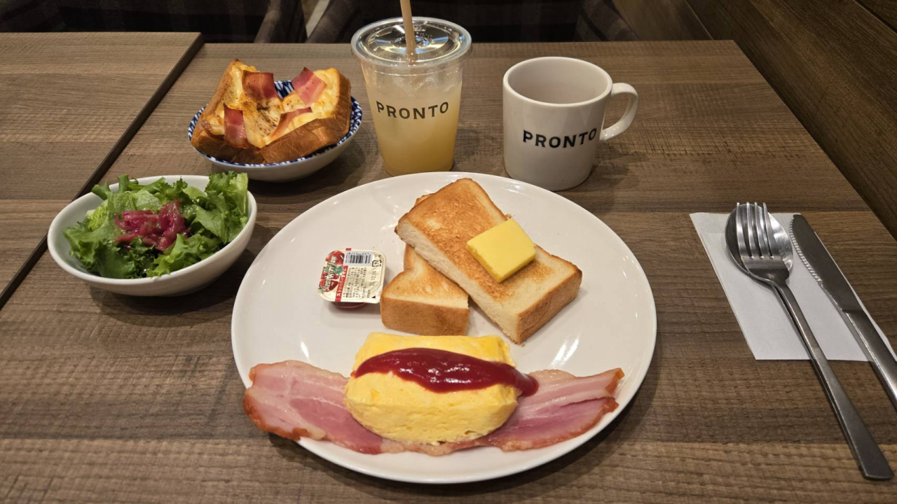 朝食はチェーンのコーヒーショップでトースト、チーズオムレツ、サラダ、スープにドリンクはおかわり自由で軽い朝食でしたがOKですね