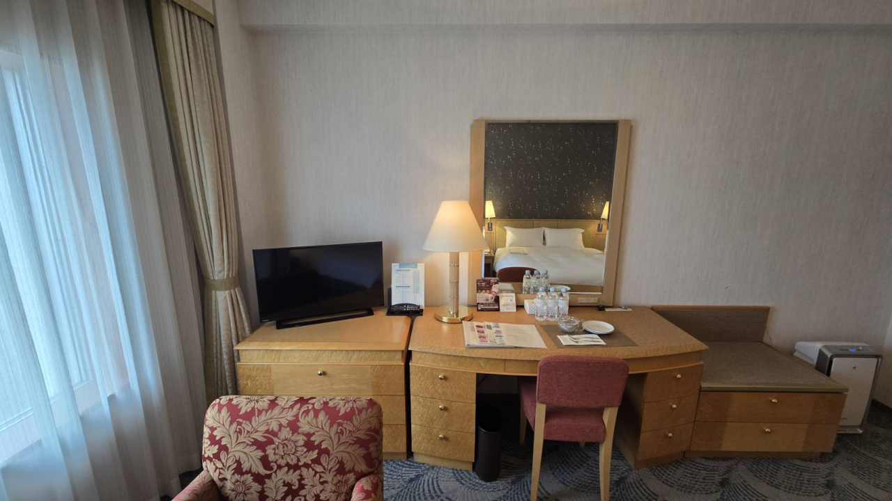 今回宿泊したツインルームはデュベスタイルのベッドメイキングの寝やすいベッドに、24㎡でコンパクトですがレイアウトが良く広いテーブルがあるのが便利で、夜はルームサービスと、パレスベーカリーでサラダにケーキをテイクアウトして部屋でゆっくりできました、眺望は大きなマンションが建ちましたが気にはならなくまぁ良いですね