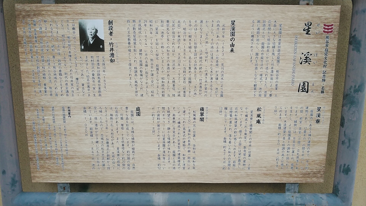 星溪園は回遊式日本庭園で、熊谷の発展に偉業を成した竹井澹如翁によって江戸時代から明治初年にかけてつくらた日本庭園で園内は無料で見学でき秋は紅葉が綺麗そうですね。園内には数寄屋建築の建物3棟、星溪寮、松風庵、積翠閣があり日本的文化教養の場として利用できるそうです。