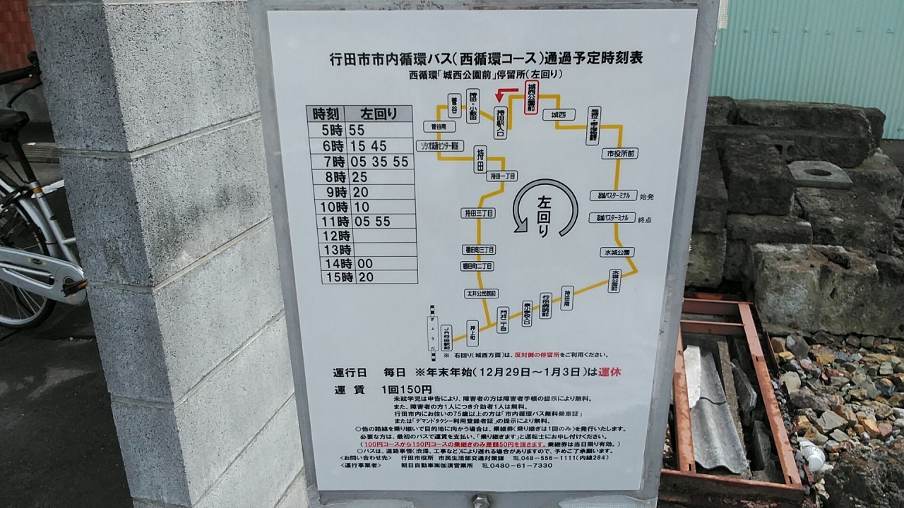 行田市の市内の循環バスで全部で6コースあります。料金も安く1回100円と150円の2タイプがあります。今回は西循環コースでたまたまバスが来て持田駅前から忍城址まで乗車しましたが、観光拠点循環コースもあって本数は少ないですがうまく活用するとお得ですね!また忍城バスターミナルには色々な路線が来るので観光の役にたちそうですね!市役所のホームページにPDFがありわかりやすいですね。
