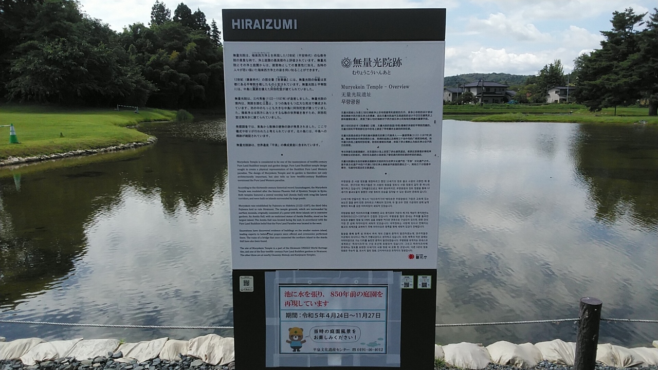 平泉駅から歩いて10分くらいで現在は池に水が張られ11月27日までは850年前の庭園の様子が再現されています。金鶏山に夕陽が沈む時間の無量光院跡が素晴らしいらしいです。